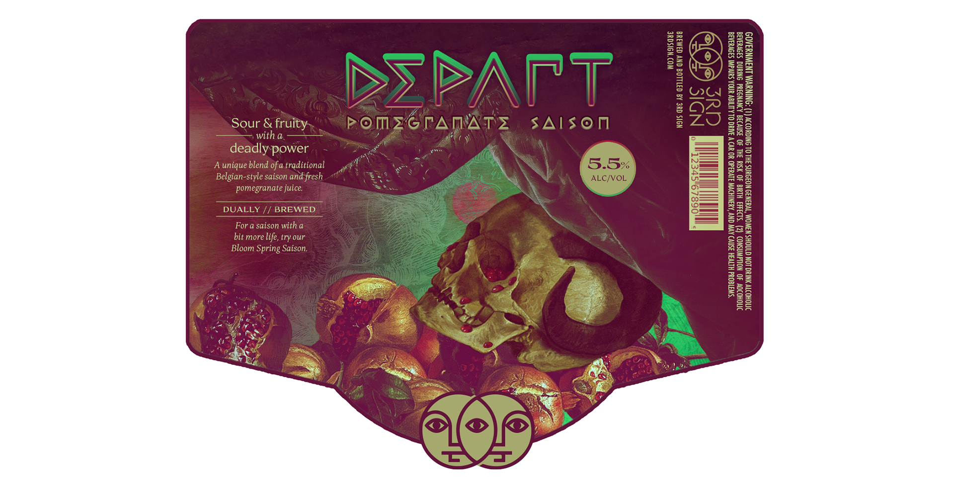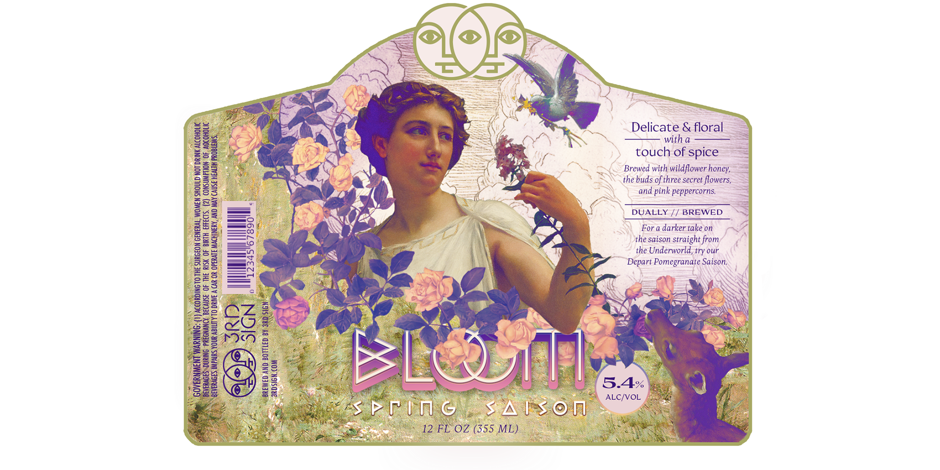 A local brewery called 3rd Sign was chosen to design for, which was born from the idea that everything in life exists on a spectrum and that interesting dualities emerge from many different facets. Applying this concept to beer styles, they release two new beers at a time, together as a pair, both from the same style—sometimes releasing limited-edition brews. In keeping with this pattern, I chose to design another limited-edition duality, this time for spring, based on the Greek Goddess Persephone, showcasing her duality as both the Goddess of Spring and of the Underworld—life and death. Collaged illustrations with bright, modern colors were used to combine the old mythology with the updated application.