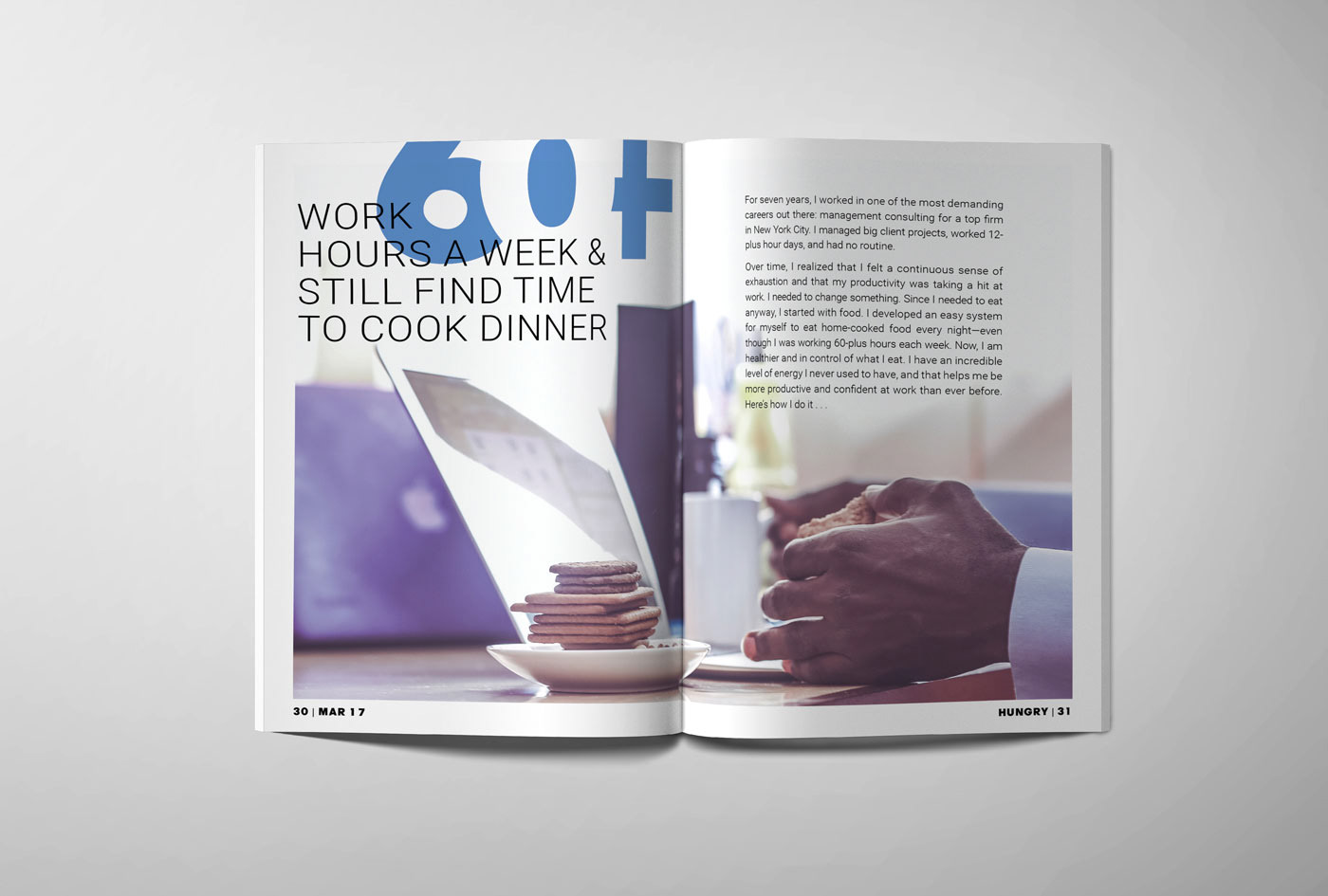 To turn the average cooking magazine on its head, a concept was developed to break out of the usual “homemaker” or “housewife” target audience and, instead, design a magazine aimed at ambitious, career-driven food-lovers with both recipes and articles aimed at reaching your goals, managing stress, and getting what you want in life. With that in mind, “Hungry” was developed for those who are always craving more in life. With a logo that plays off of negative space, the design is minimal, modern, and to-the-point, but still retaining a sense of naturalism and lightheartedness that comes from good food and good vibes.