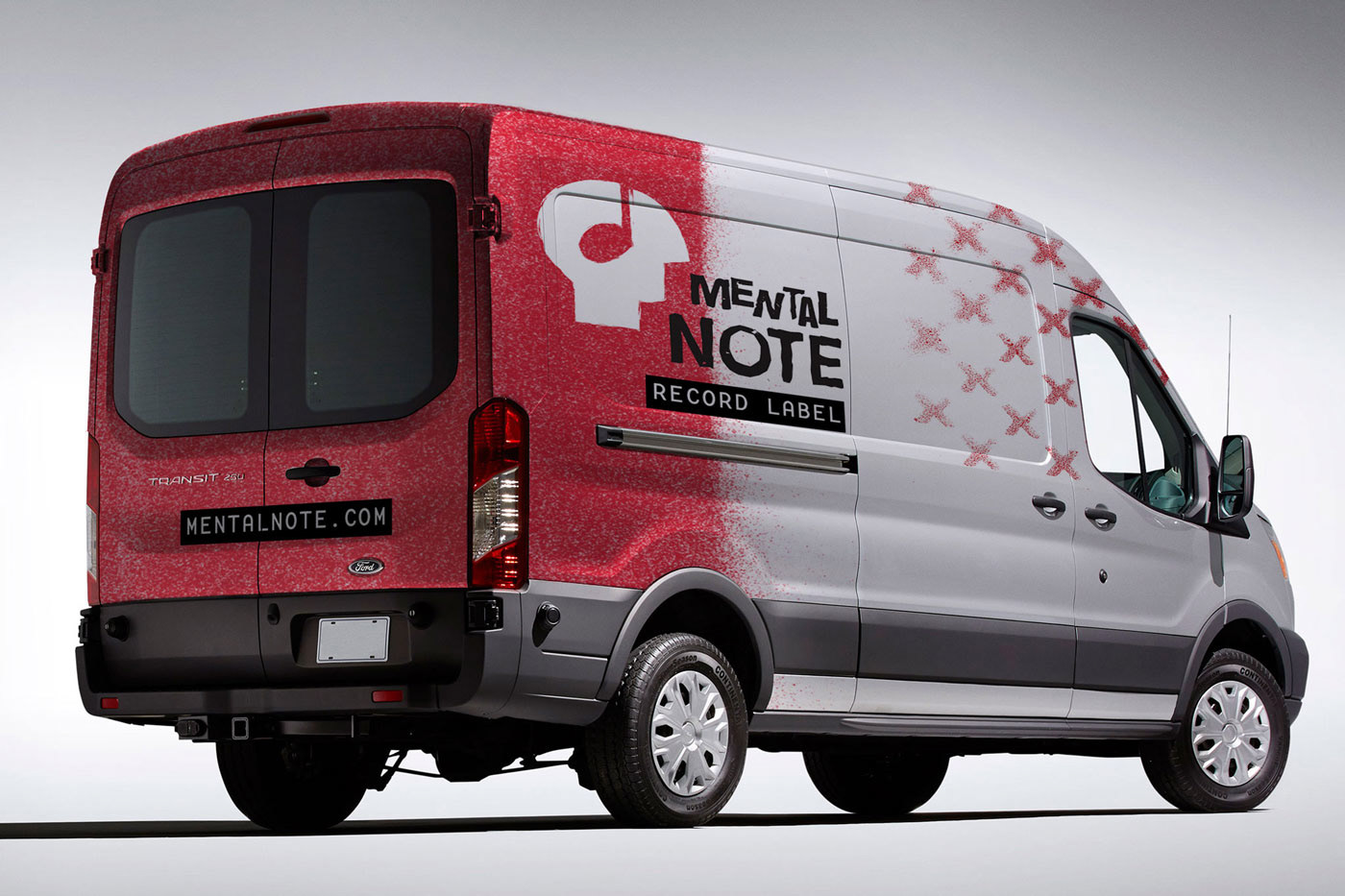 Design a brand identity for a fictional record label including a name, logo, letterhead, envelope, business cards, and vehicle design.