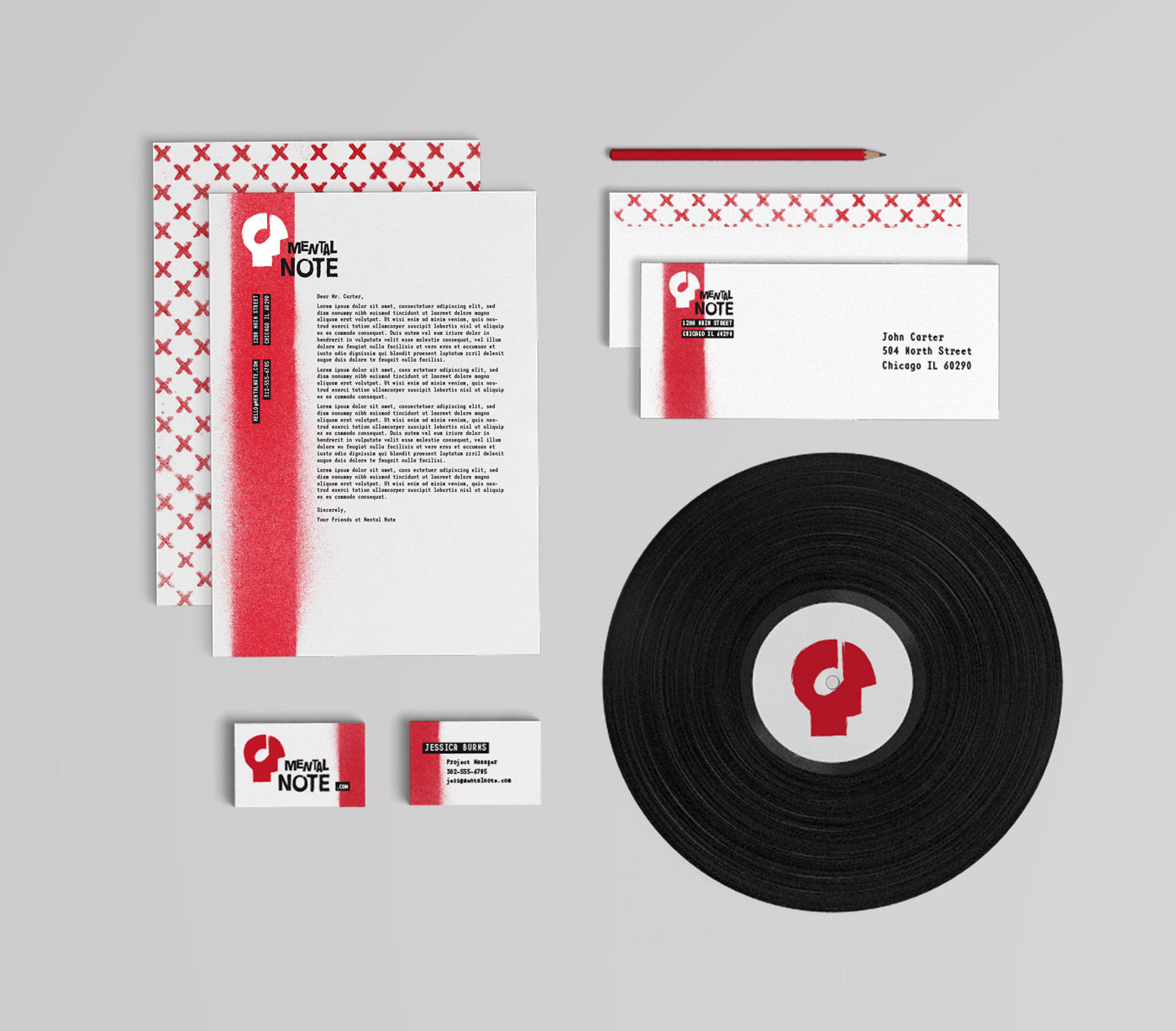 Mental Note is a punk/underground rock label based in Chicago that has adopted the modern convenience of the new millennium but haven’t given up the DIY values they were founded on in 1978, working closely together with artists to create original material out of blood, sweat, and tears. From this description, a logo and brand identity style was created to reflect both the punk and DIY aspects of their values featuring a spray painted accent and hand-drawn rough edges.